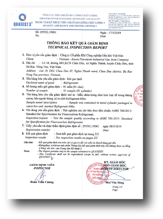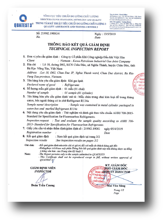 Located at Chau Duc IP, Ba Ria-Vung Tau, our factory covers on the area of over 40.000 m2 and facilities in producing all kind of Refrigerant Gases, Blowing Agent, and Fire Extinguishing Agent. We are professional manufacturer of various kind of refrigerant gases in Vietnam made by Korean technology. Our main products are Eco-friendly. Refrigerant Gases such as R134a, R404A, R407C, R507A, R600a, … which are high quality and safe for usage as well as saving the environment. Our products are not only produced by Viet Nam experienced engineers team but also strictly tested on quality by AHRI standard.