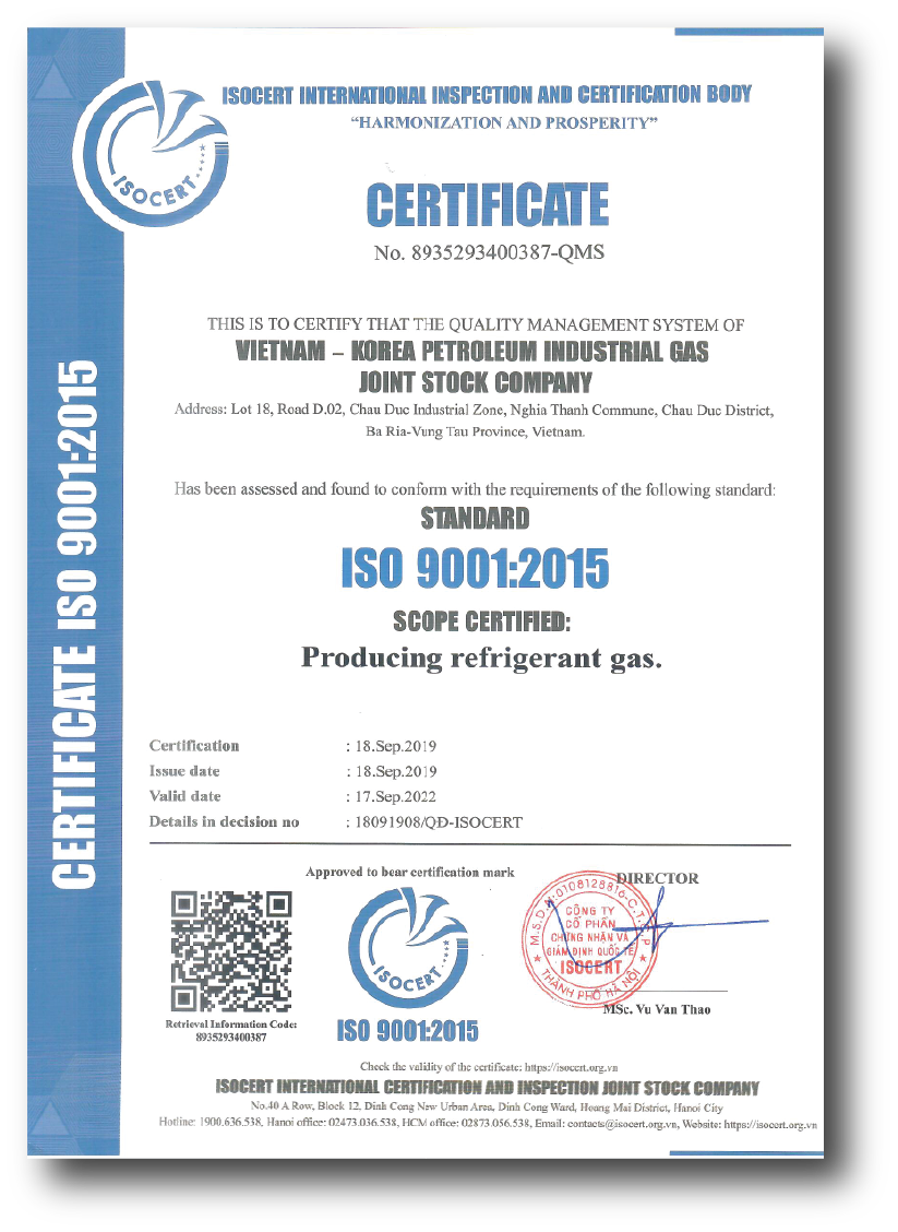 With the goal of producing environmentally and friendly refrigerants, PVCK has minimized the amount of carbon emissions contained in the refrigerants. Modern production process and advanced technology ensure the quality and efficiency of the products. All products made are strictly controlled, high purity reaches 99,9%. Our products are certified according to ISO 9001 : 2015 and AHRI700 Standard.